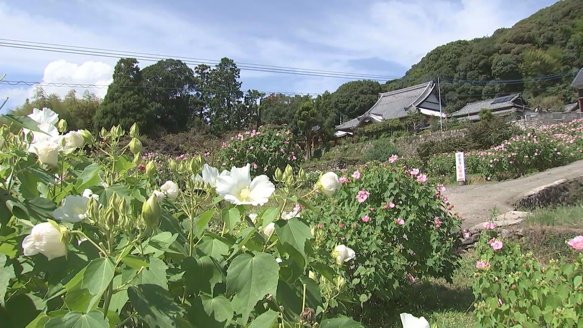 杵築市溝井にある宗玄寺ではいま、境内や参道に植えられたフヨウの花が見ごろを迎えています。