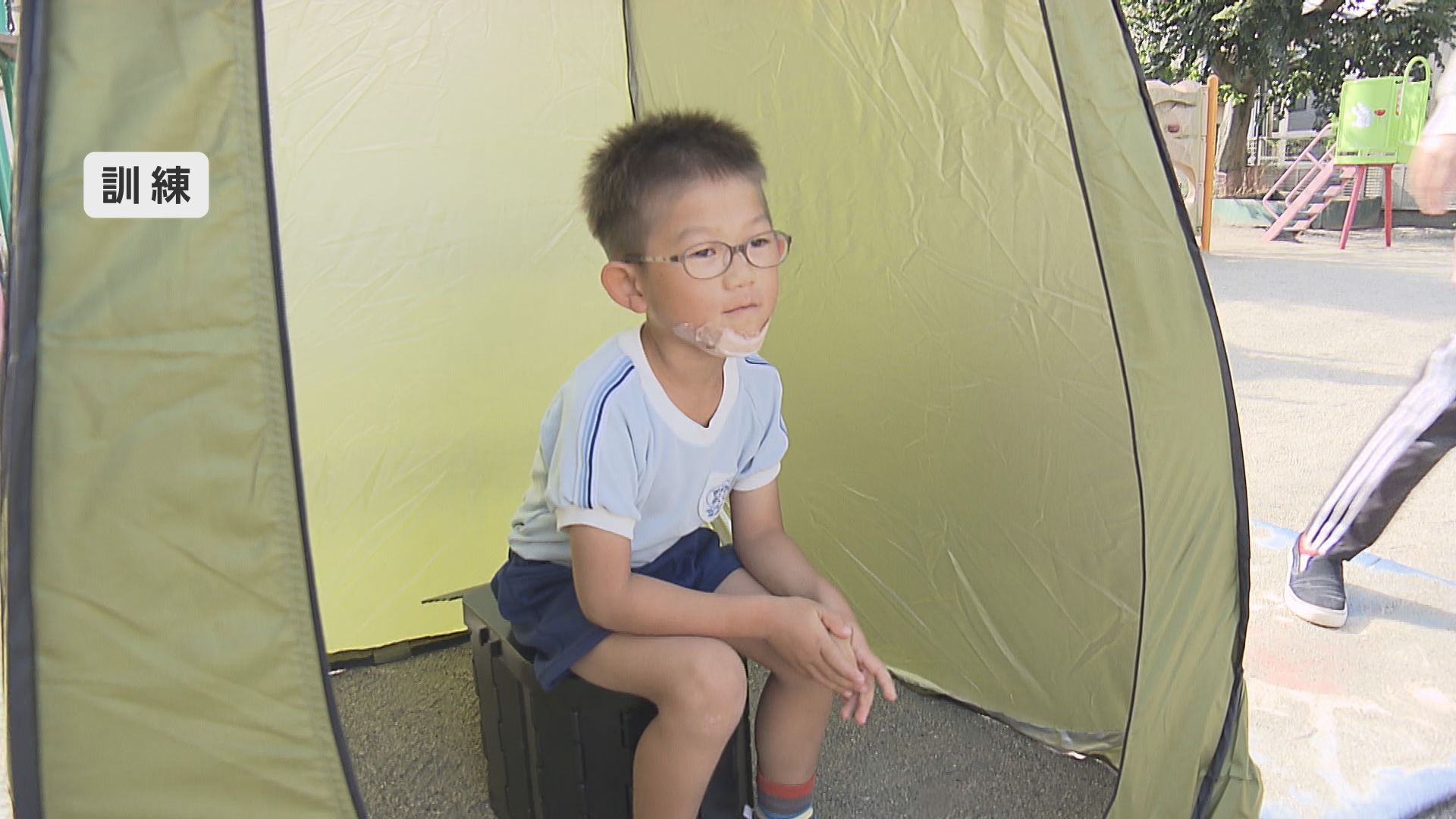 この中では職員がけがをした園児を担架で運ぶ手順などを確認したほか、園児が災害用の簡易トイレに実際に座って使い方を学びました。