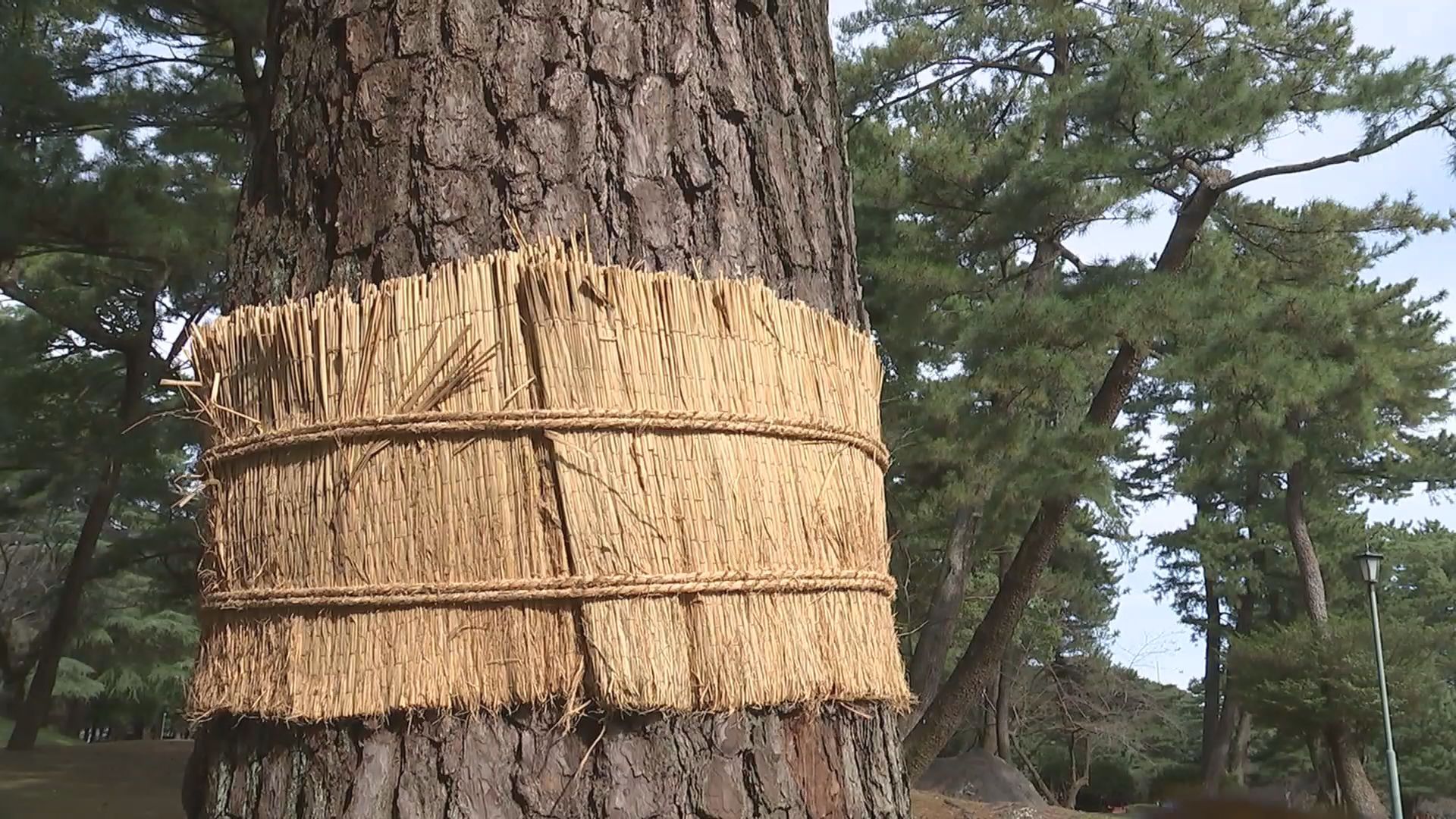 「こも」は公園内のおよそ400本の松に巻き、作業は4日中に終える予定だということです。