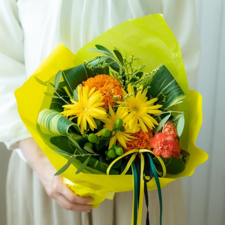 ブーケを構成する⻩⾊のガーベラの花⾔葉は「希望」、オリーブの⽊の花⾔葉は「平和」。