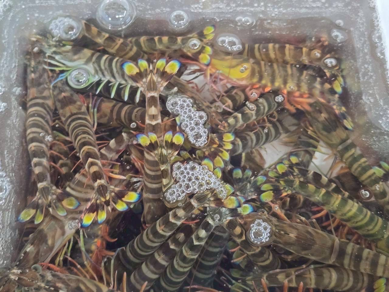 そこで今回は神戸さんと「姫島車えび」がどのように出荷されていくのかを調査するため「姫島車えび養殖株式会社」を訪ねました。ここで急遽、海水が入った出荷用の箱に神戸さんが車えびを入れてみる事に。活きが良くて跳ねる跳ねる!一尾ずつ入れる度に大騒ぎでした。