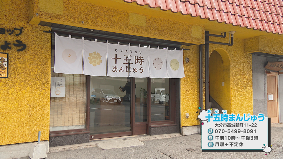 まずは、大分市高城駅の近くにある「十五時(おやつ)まんじゅう」。かわいいのれんが目印です。