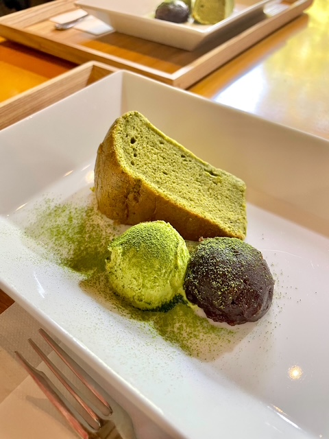 様々な抹茶スイーツがある中から、風の郷さん内にあるカフェ煎で『あったか抹茶シフォンケーキ』を頂きました。きつき茶がふんだんに入ったシフォンケーキは鮮やかな緑で、きつき茶で作るからこそ出る緑なんだとお店の方に教えていただきました。ケーキの甘味がより抹茶を際立たせる、絶妙なバランスの味でした。