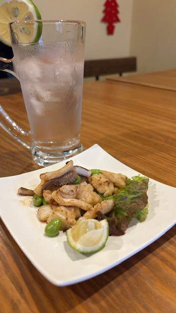 そのうちの1軒、津久見駅前商店街の「ビストロカフェ華うさぎ」では、大分むぎ焼酎 二階堂をソーダで割った通称「ニカソー」とモイカのバター焼きをいただきました。