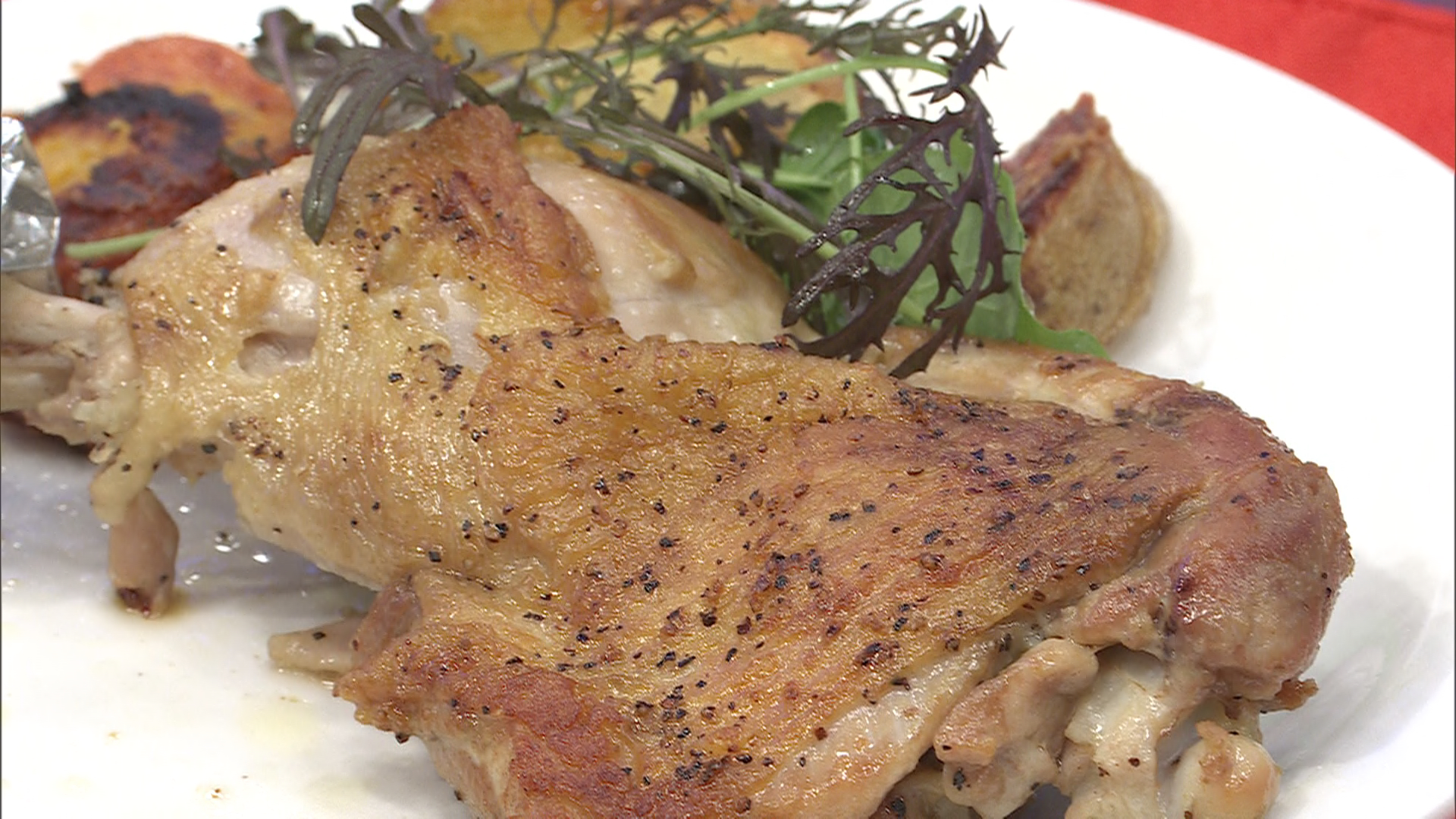 ⑥ 鶏肉の皮目に焼き色がついたら返し、蓋をして火が通るまで中火で加熱する。