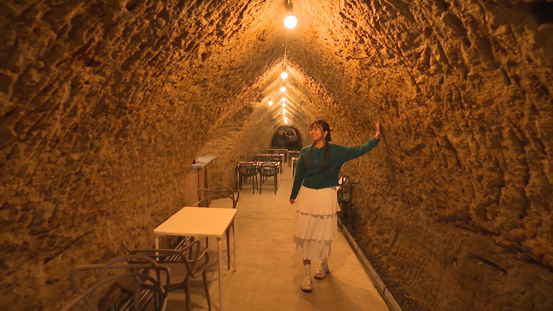 奥に伸びた空間は、壁がごつごつしています。実はここ、防空壕を活用した飲食スペースなんです。
