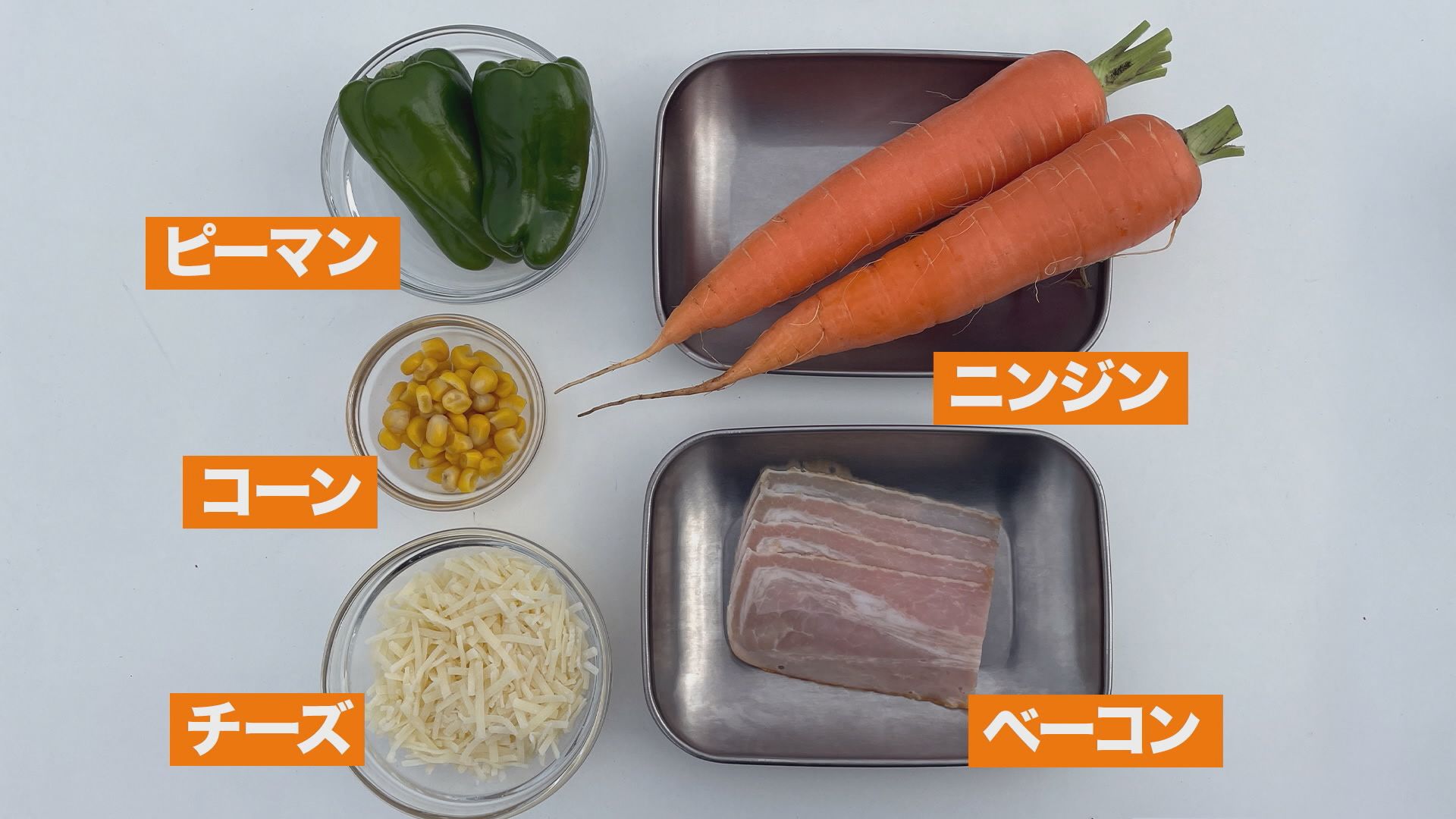 ・ニンジン ・ピーマン ・コーン ・ベーコン ・チーズ ・薄力粉 ・片栗粉 ・塩 ・コショウ ・オリーブ油 ・水